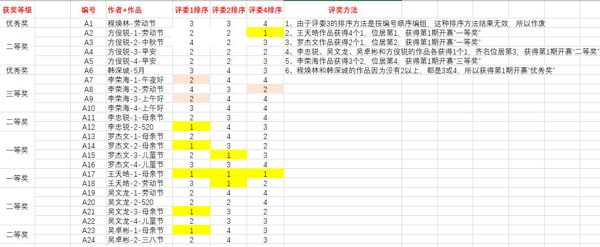 经来自全国不同的3位专家评委的评奖结果,报名参加“首届巴拿赫图片设计大赛”的9位同学共制作了24张图片,最后获奖名次如下: