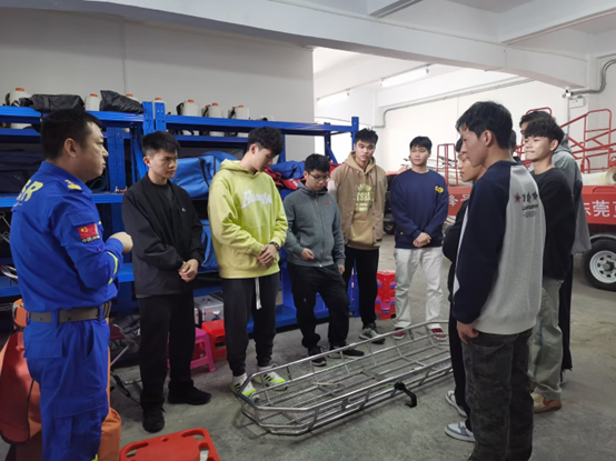 2023年12月3日上午,趁着创新应急学生还在企石消防救援支队新南分站进行绳索高空升降实训和实践,张家杰队长热情邀请创新应急救援技术专业师生到东莞蓝天救援队参观学习各种应急救援装备。