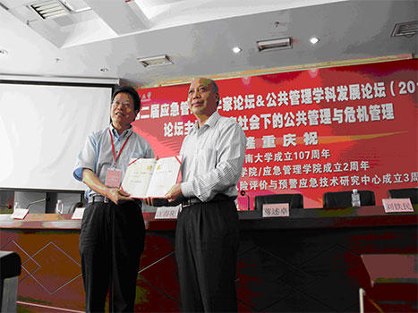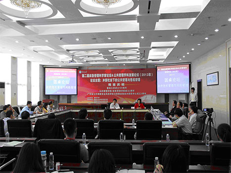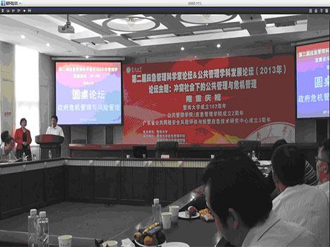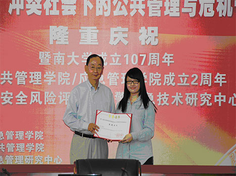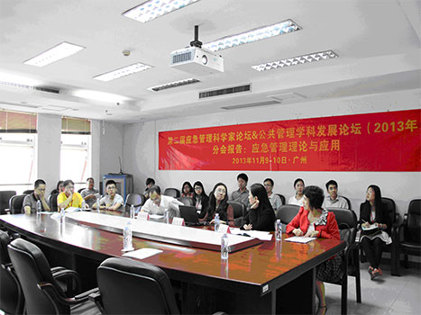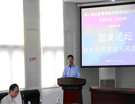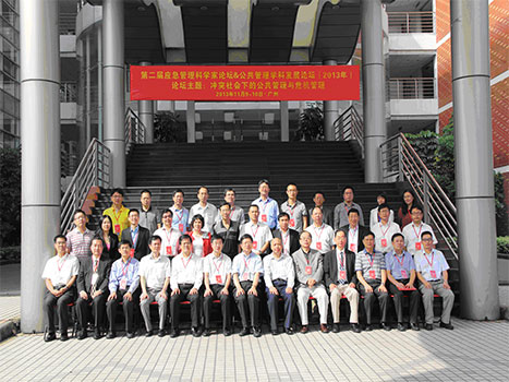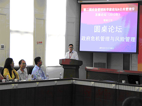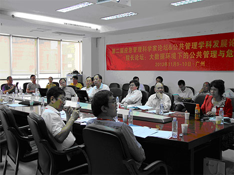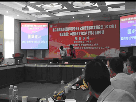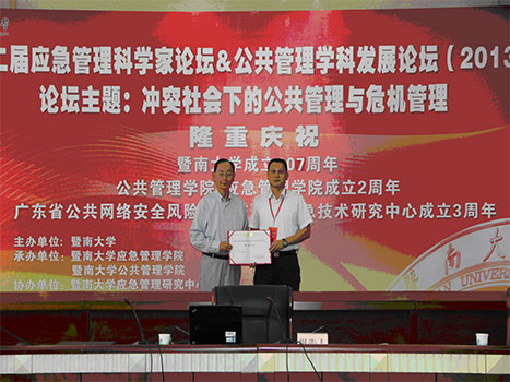 由暨南大学主办、公共管理学院/应急管理学院承办的“第二届应急管理科学家论坛&公共管理学科发展论坛(2013年)”于2013年11月9-10日在我校隆重举行。暨南大学党委书记蒋述卓、中国科学院数学与系统科学研究院党委书记兼副院长汪寿阳、中国安全生产科学研究院前院长刘铁民、澳门科技大学前副校长陈乃九、广东省政府应急办主任纪家琪、广州市城市管理委员会主任危伟汉、广东省银监局副局长张坚红、广东省地震局副局长梁干、广东省交通厅副厅长刘晓华、广东省气象局副局长庄旭东、广东省应急产业协会会长黄洪涛、广东省疾病预防控制中心主任张永慧、广东省消防总队作战指挥中心主任朱国营以及来自中国科学院大学、暨南大学、清华大学、浙江大学、北京师范大学、中山大学、厦门大学、北京师范大学、西南财经大学、华南理工大学、重庆大学、成都电子科技大学、广东工业大学、广州大学、广东外语外贸大学、汕头大学等全国16所高校和10个政府部门共100多名应急管理与公共管理领域的著名专家、高层领导、老师和学生出席了论坛,共同探讨论坛主题:冲突社会下的公共管理与危机管理。