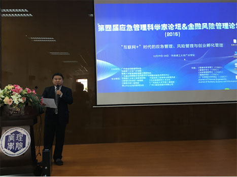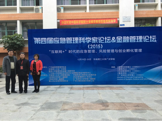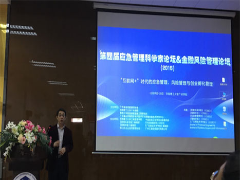 2015年12月19-20日 ,“第四届应急管理科学家论坛&金融风险管理论坛(2015)“在华南理工大学广州学院举行,本次论坛主题为:“互联网+”时代的应急管理、风险管理与创业孵化管理。本次活动由广东省信用管理师协会、华南理工大学广州学院管理学院、暨南大学金融工程研究所、广东省公共网络安全风险评价与预警应急技术研究中心等单位联合主办;由华南理工大学管理学院、佛山信用管理协会等单位协办。论坛结合当前形势,围绕“‘互联网+’时代的应急管理、风险管理与创业孵化管理”主题,就当前“互联网+”浪潮下社会发展的重大问题展开学术交流。