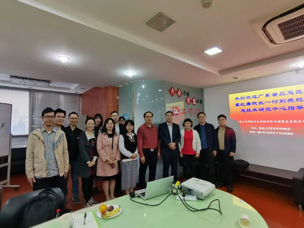 2021年12月9日下午,应暨南大学应急管理学院和广东省公共网络安全风险评价与预警应急技术研究中心的联合邀请,广东省应急医院院长瞿红鹰一行应邀来到我校,得到应急管理学院党委书记廖勇和应急技术研究中心主任庞素琳等的热烈欢迎。廖书记和庞教授以及应急技术研究中心全体硕博士生亲自到管院一楼大堂迎接瞿院长一行的到来。