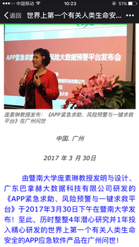 由暨南大学庞素琳教授发明与设计、广东巴拿赫大数据科技有限公司研发的《APP紧急求助、风险预警与一键求救平台》于2017年3月30日下午在暨南大学发布!至此,历时整整4年潜心研究并1年投入精心研发的世界上第一个有关人类生命安全的APP应急软件产品在广州问世!