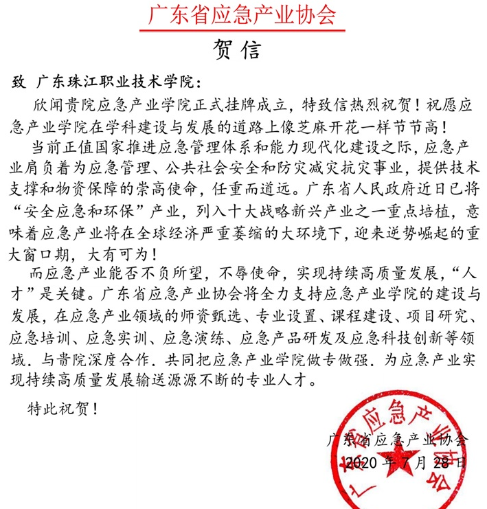 由于时间上的冲突,广东省应急产业协会会长翁冠雄未能出席本次揭牌仪式。但他代表协会发来了贺信,祝福应急产业学院在学科建设与发展的道路上像芝麻开花一样节节高!协会表示,广东省应急产业协会将全力支持应急产业学院的建设与发展。今后在应急产业领域的师资甄选、专业设置、课程建设、项目研究、应急培训、应急实训、应急演练、应急产品研发及应急科技创新等将与应急产业学院深度合作,共同把应急产业学院做大做强,为应急产业实现持续高质量发展输送源源不断的专业人才。