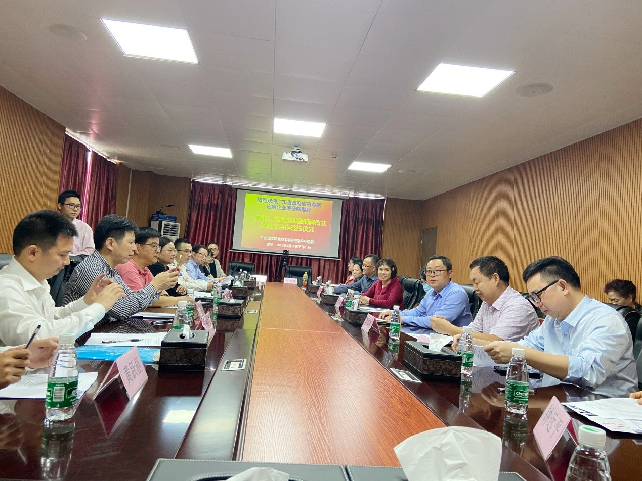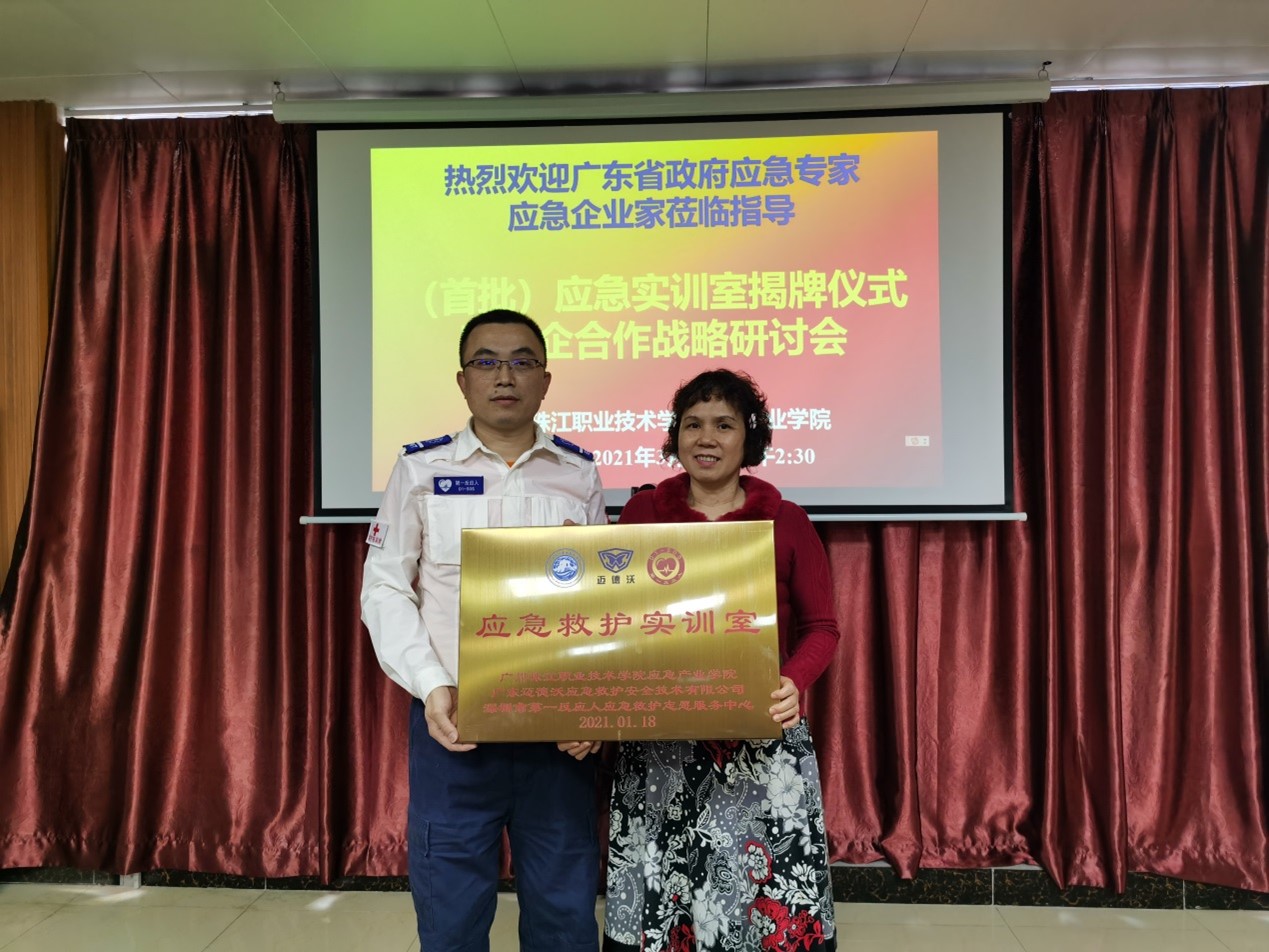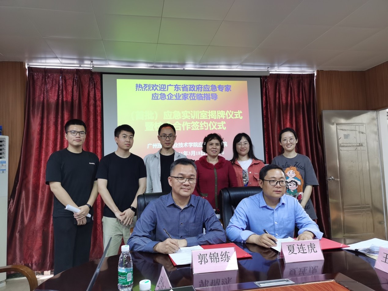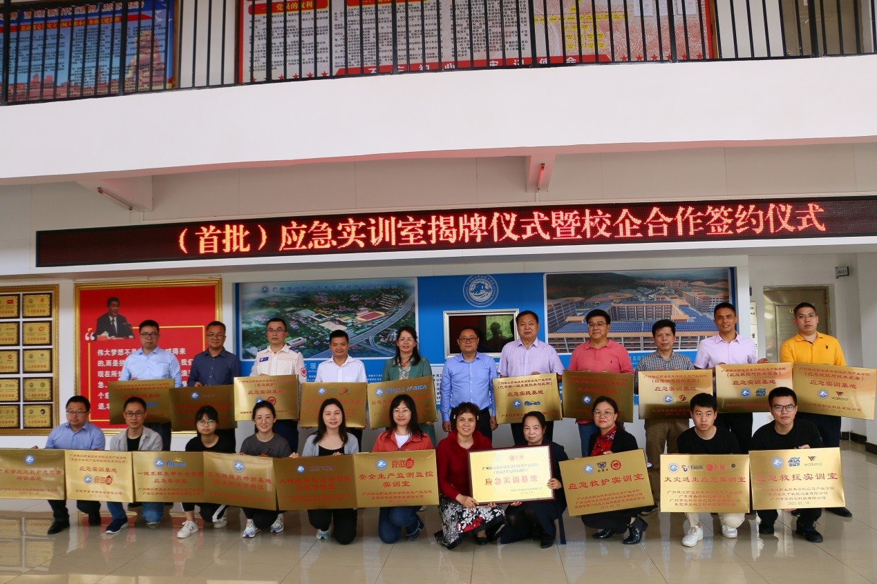 2021年3月18日下午,全国首个应急产业学院在广州珠江职业技术学院隆重举行(首批)应急实训室和应急实践基地大型揭牌仪式、院企合作签约仪式、企业导师聘任仪式暨院企合作战略研讨会。广东省政府应急专家、自然资源部广州海洋地质调查局原副局长李国胜;惠州市应急管理局调研员卢小丽;广州珠江职业技术学院校长夏连虎和信息工程技术学院院长卢银花;全国首个应急产业学院院长、暨南大学应急管理学院教授庞素琳师生团队;以及来自广州、深圳、东莞、惠州、佛山等广东省14家应急企业负责人出席了揭牌仪式,共同为广州珠江职院应急产业学院首批9个应急实训室、12个应急实践基地和2个应急培训基地揭牌。