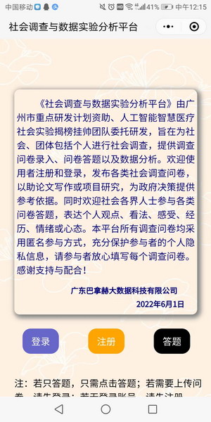 巴拿赫重磅消息:今天是六一国际儿童节,欢乐的好日子!巴拿赫向全社会发布:由广州市重点研发计划资助、人工智能智慧医疗社会实验揭榜挂帅团队委托研发的《社会调查与数据实验分析平台》今日正式投入市场试运行。试运行时间为三个月:2022年6月1日至8月31日!